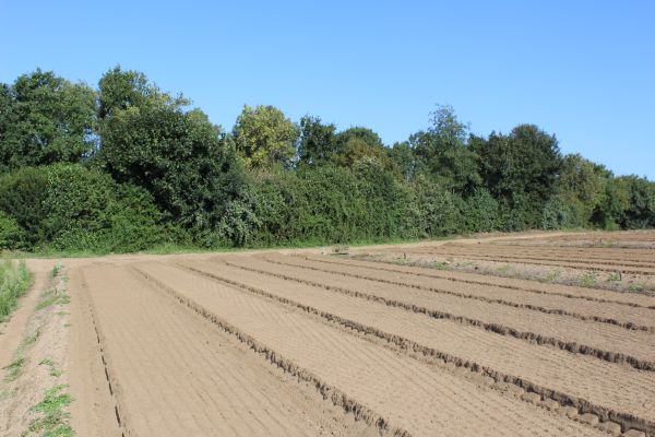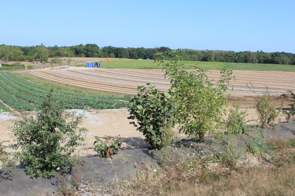 Des arbres autour de ses cultures de mâches ou de jeunes pousses, Gilbert Pineau en a toujours connu. Quand il acquiert ses premières parcelles en 1997 dans la vallée maraîchère nantaise, le propriétaire lui demande de conserver les chênes présents sur le site. En décalant les dates de semis et plus récemment avec le trieur optique, il s’affranchit du problème des feuilles mortes dans les salades. « Je me suis aperçu qu’il était agréable de travailler dans un environnement entouré de végétation », confie-t-il. C’est donc naturellement qu’il a continué à implanter des haies ou des alignements de frênes, de son propre chef ou avec l’appui technique et économique du SYLOA, sur ses parcelles au fil des agrandissements de l’exploitation. Ces infrastructures agroécologiques sont aujourd’hui pensées pour améliorer la qualité de l’eau sortant de ses champs. « Je les plante toujours sur talus. En bas de parcelle, cela permet de retenir les écoulements de sable. Je le récupère et le remets sur les planches ensuite », témoigne-t-il.